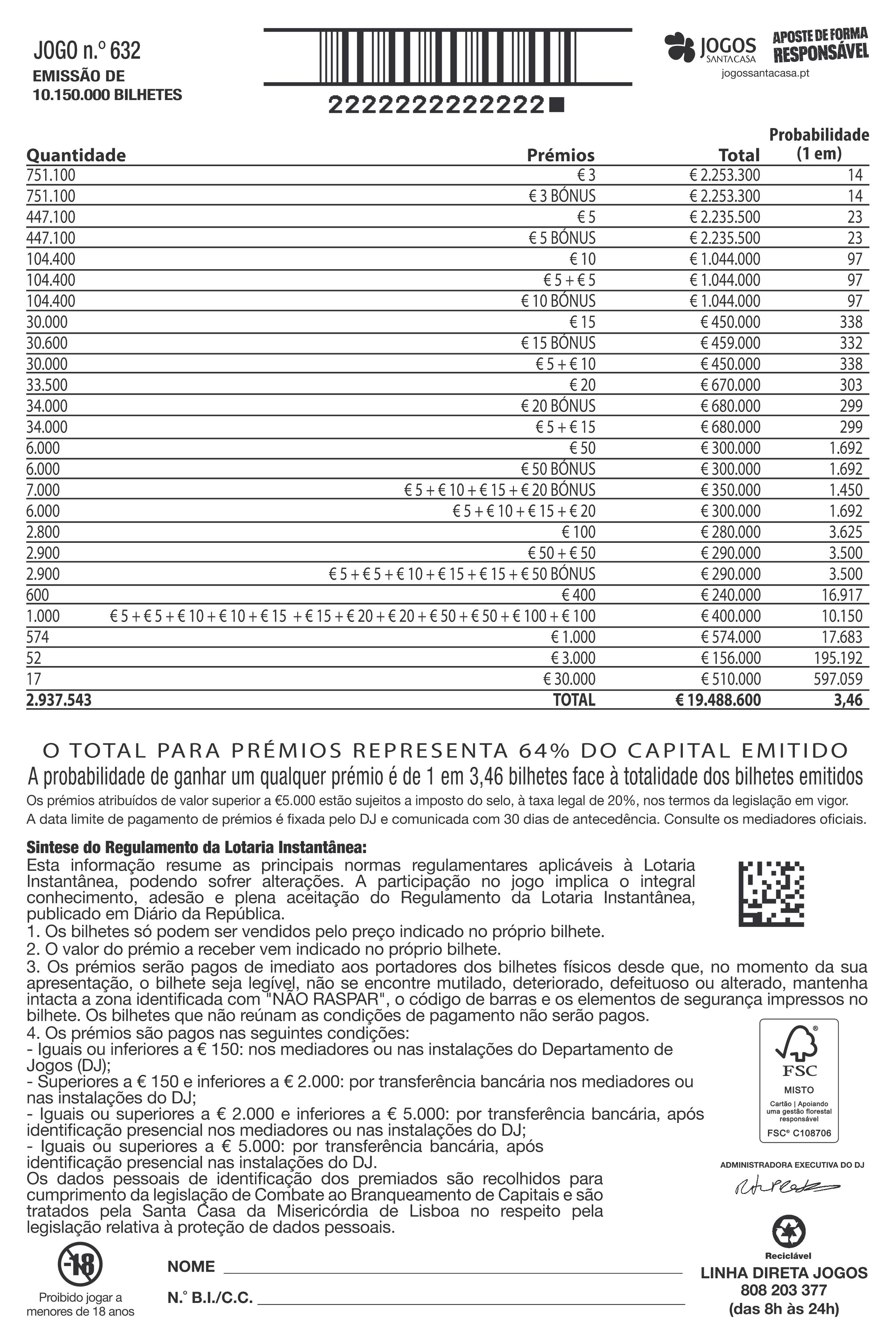 Preço do bilhete para o apostador - € 3
