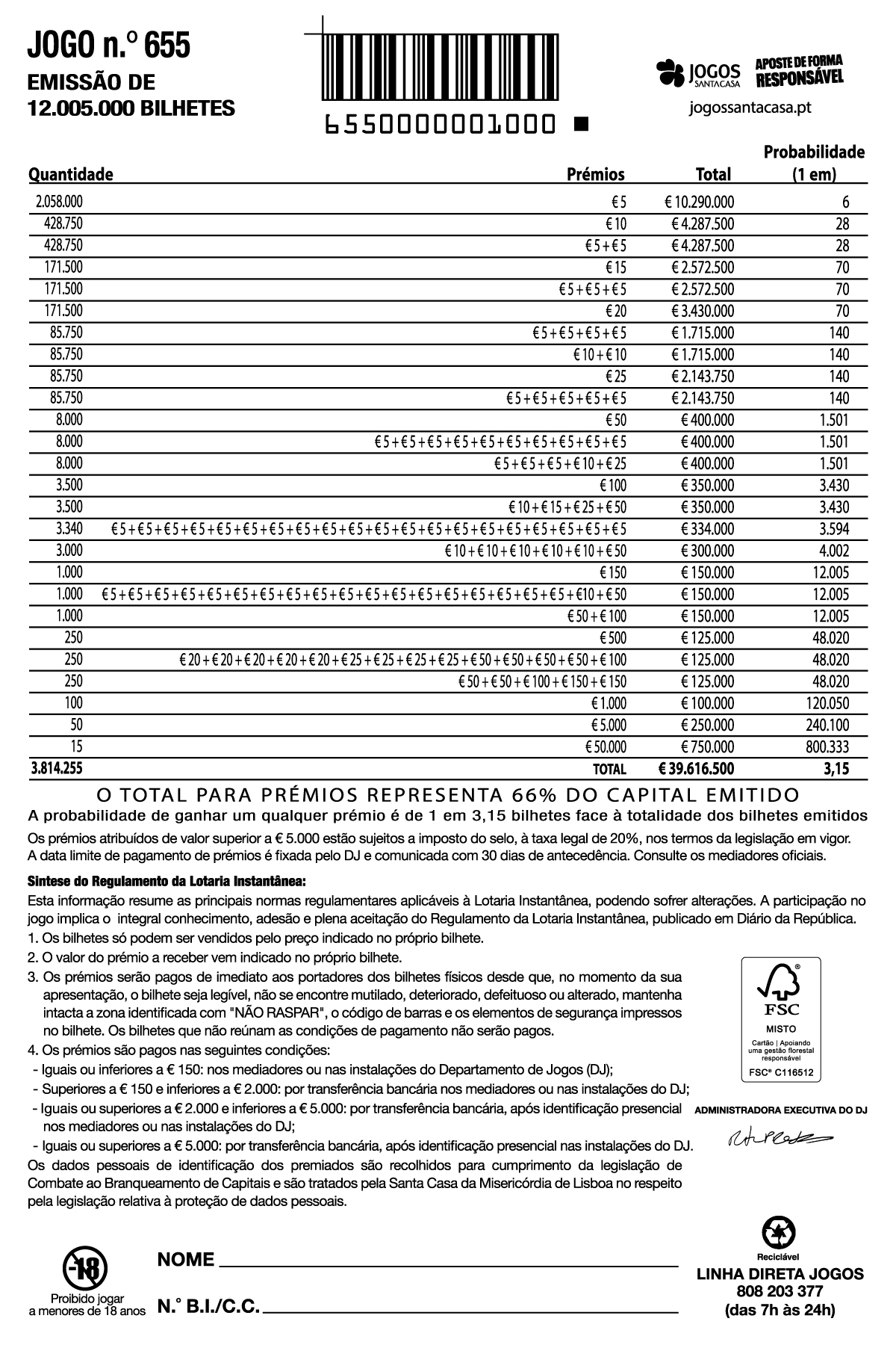 Preço do bilhete para o apostador - € 5